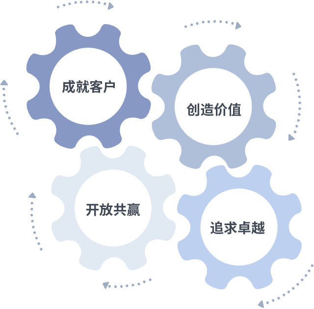 成就客户是一切决策的出发点,,,创造价值是衡量所有工作的标准,,追求卓越是我们做事做人的态度,,,开放共赢是我们的格局也是最终的结果。。。价值观的齿轮环环相扣,,,,推动着组织里的每个人不断向前。。。。