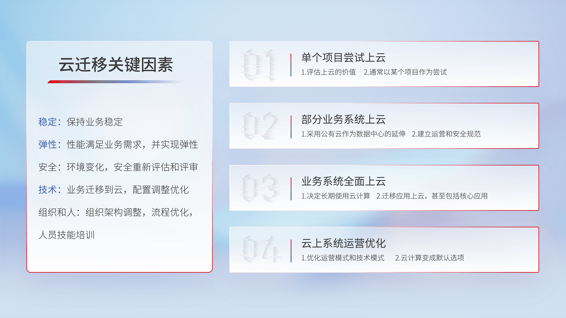结合实际业务,,,从规划设计、、、、云平台选型、、云原生改造、、、数据迁移、、、集成交付,,迁移全过程为客户识别最佳上云路径,,,做好风险识别管理,,,,设计网络架构、、身份权限、、、、安全审计合规、、操作审计、、日志审计、、监控告警策略、、、多站点容灾设计等,,,对云上基础设施进行整体规划,,,,提升IT治理水平,,,以满足弹性、、、、高可用、、、高性能的需求。。。。