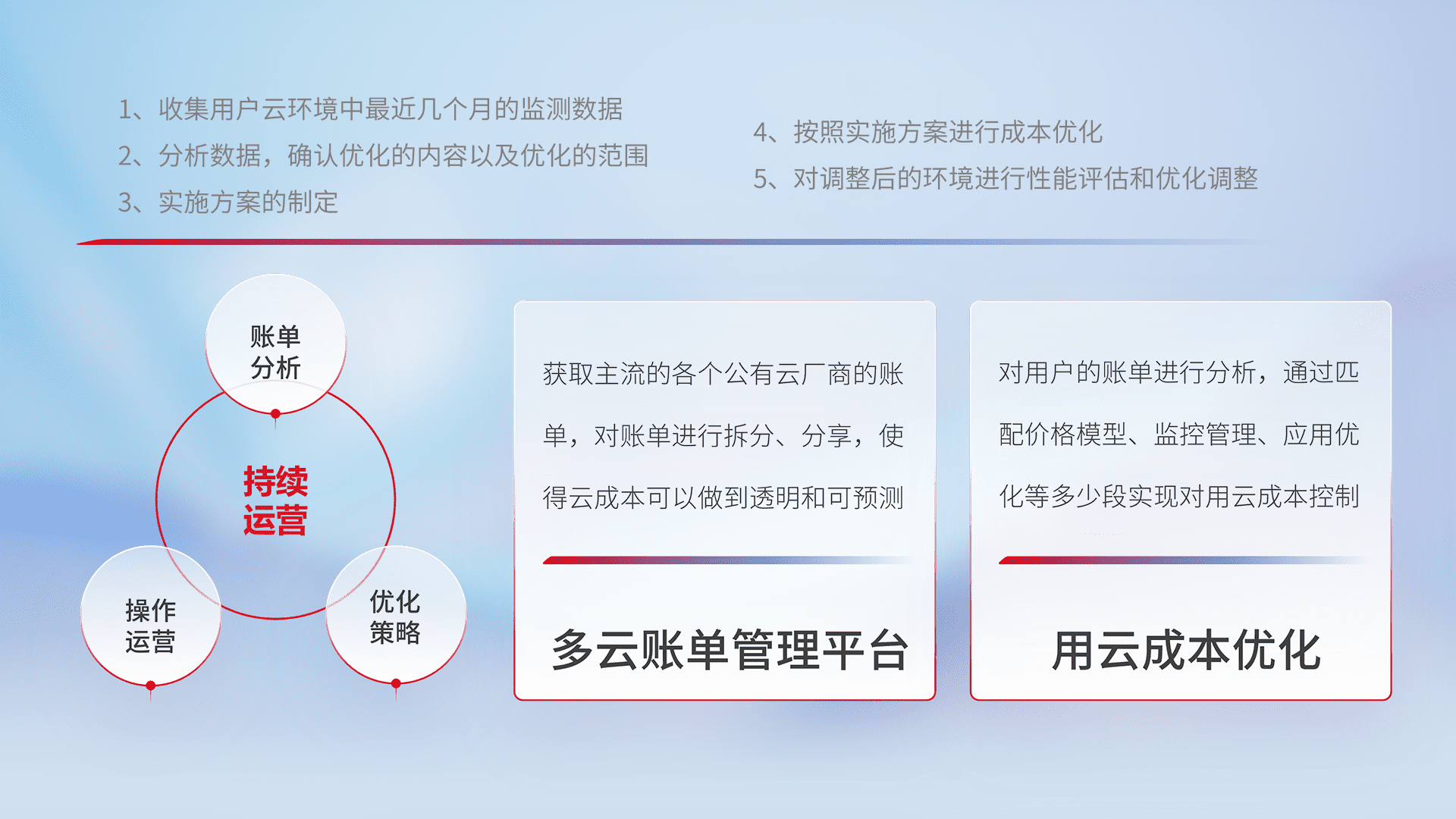 通过多云纳管,,,以统一的资源数据模型把客户的云资源进行抽象和封装,,,,进而实现对多云资源的统一操作,,,保障云资源管理的可靠性、、稳定性与可用性。。。。量身定制化运维内容,,配置、、开发运维、、补丁管理、、、、备份、、、监控、、认证和访问管理、、、审计和日常巡检等,,保障在用云过程中的可靠度,,,,稳定度以及高可用率。。。